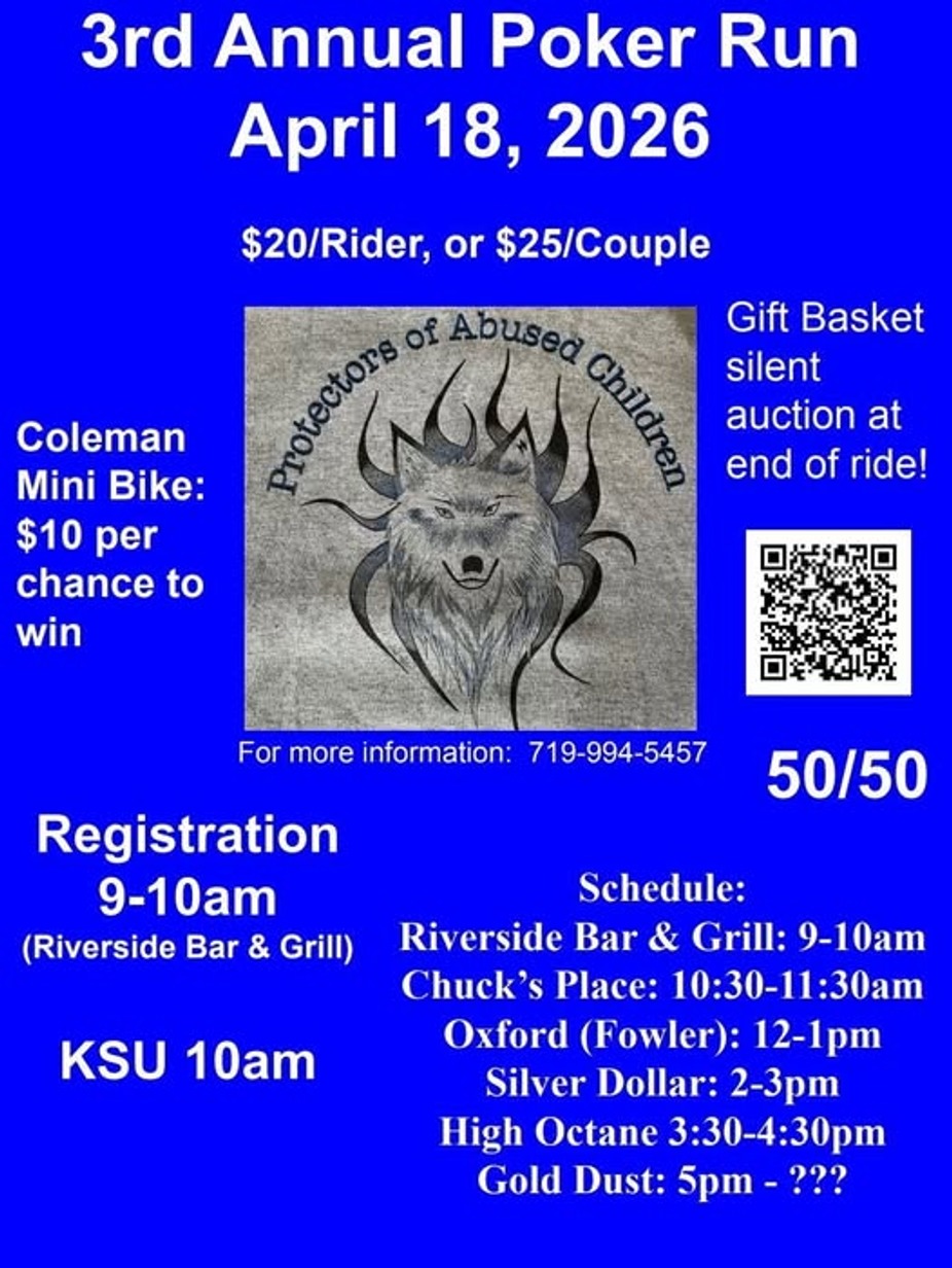 Help a great cause and join the 3rd Annual Poker Run with Protectors of Abused Children on 04/18/26. Registration is at Riverside Bar & Grill from 9am-10am, then enjoy a day of riding, The fun will end up at The Gold Dust at 5pm. $20/rider, $25/ couple. Don't ride, but want to help out? We will have silent auction items at the Gold Dust, the week of the event and donations can be made now through the end of the event!