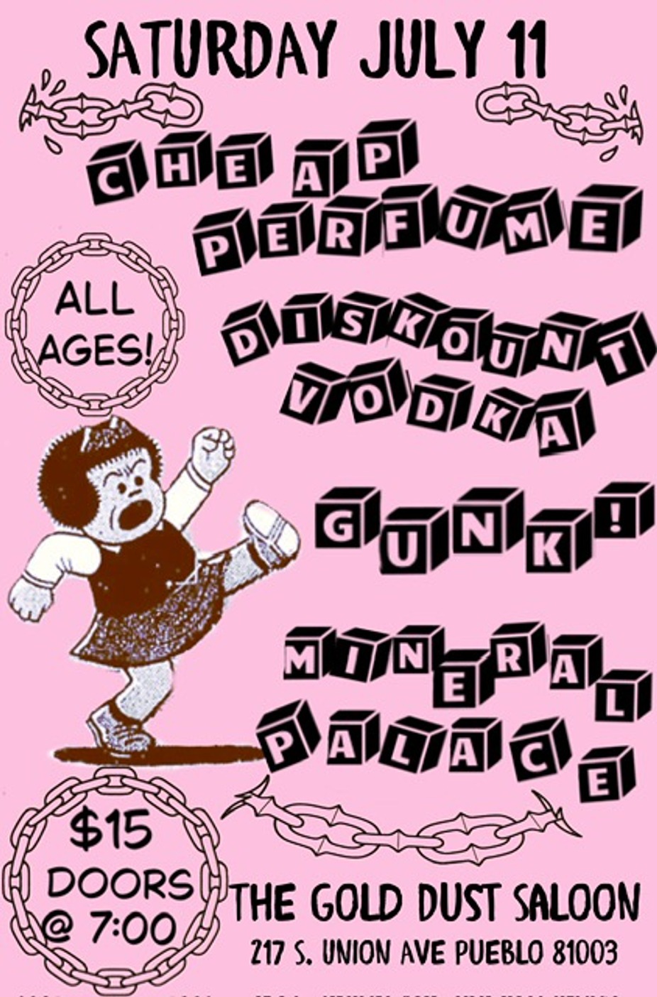 Join us for a night of punk rock with Cheap Perfume out of CO Springs with Special Guests Diskount Vodka, Gunk!, and Mineral Palace. With this lineup, you're not going to want to miss out! All Ages. Doors @ 7pm, show @ 8 pm. $15 @ the door.