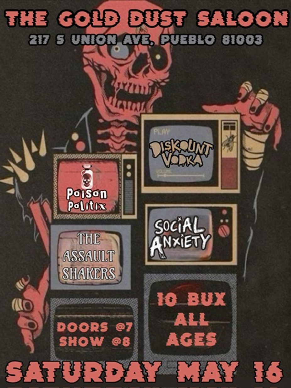 Join us for a night of great punk rock at The Gold Dust with Diskount Vodka along with special guests Poison Politix, Social Anxiety and The Assault Shakers. All Ages. Doors @ 7pm, Show @ 8pm. $10 @ the Door.